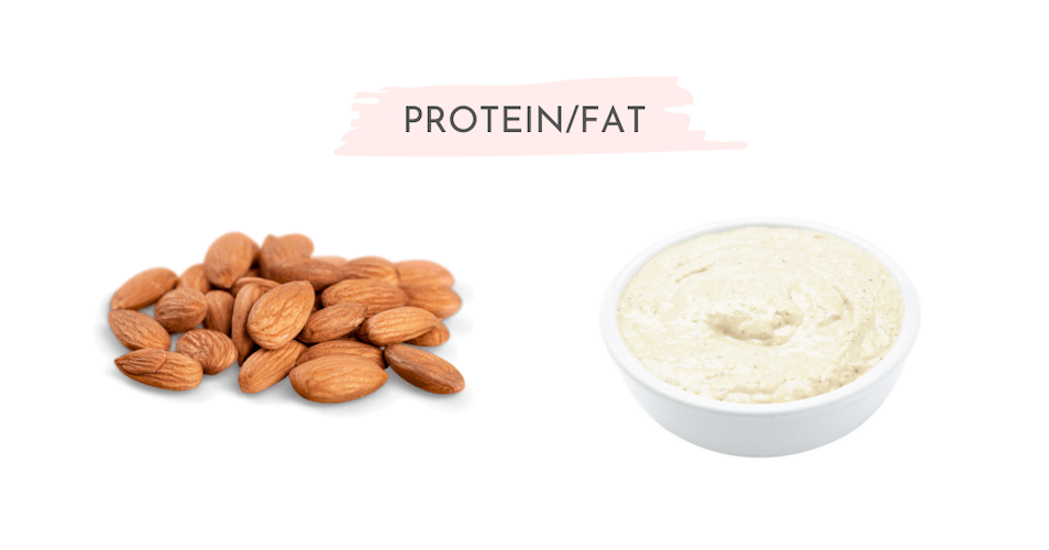 I recommend pairing a fat/protein with veggie, fruit or whole-grain for long-lasting energy. Often, people just snack on veggies, fruit or carbs alone and find themselves unsatisfied and ravenous within an hour or so. Fat and protein move more slowly through the digestive tract and help us avoid big peaks and valleys in blood sugar levels.