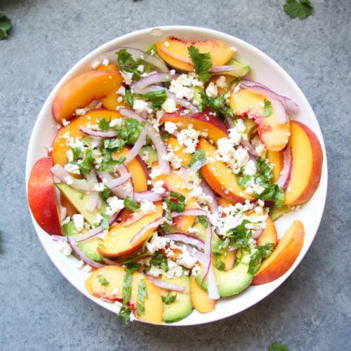 - Sprinkle the red onion, crumbled feta, and cilantro over the peaches and avocado.