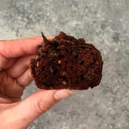 This recipe was borne out of my love of chocolate and my (undeclared) desire to be a better baker. I’ve been experimenting with all sorts of healthy baked good recipes lately, and muffins have become one of my favorite things to whip up on a whim. Since there’s only two of us, I always stash a couple in the freezer for an easy brekkie addition or dessert.