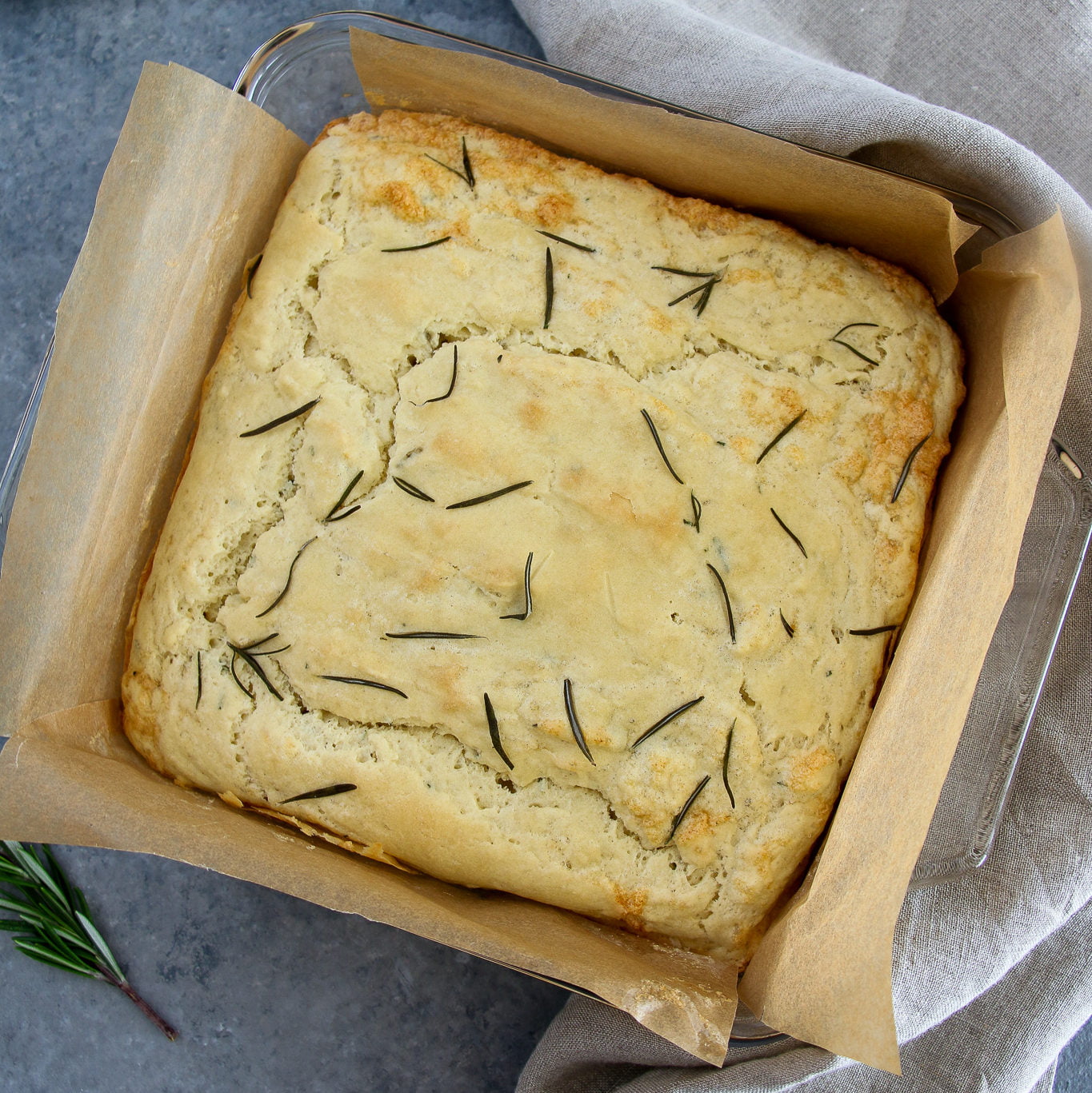 - Pour the focaccia batter into the lined baking dish and sprinkle with the remaining chopped rosemary. Insert the baking dish into the oven and bake for 30-35 minutes or until a toothpick comes out clean.