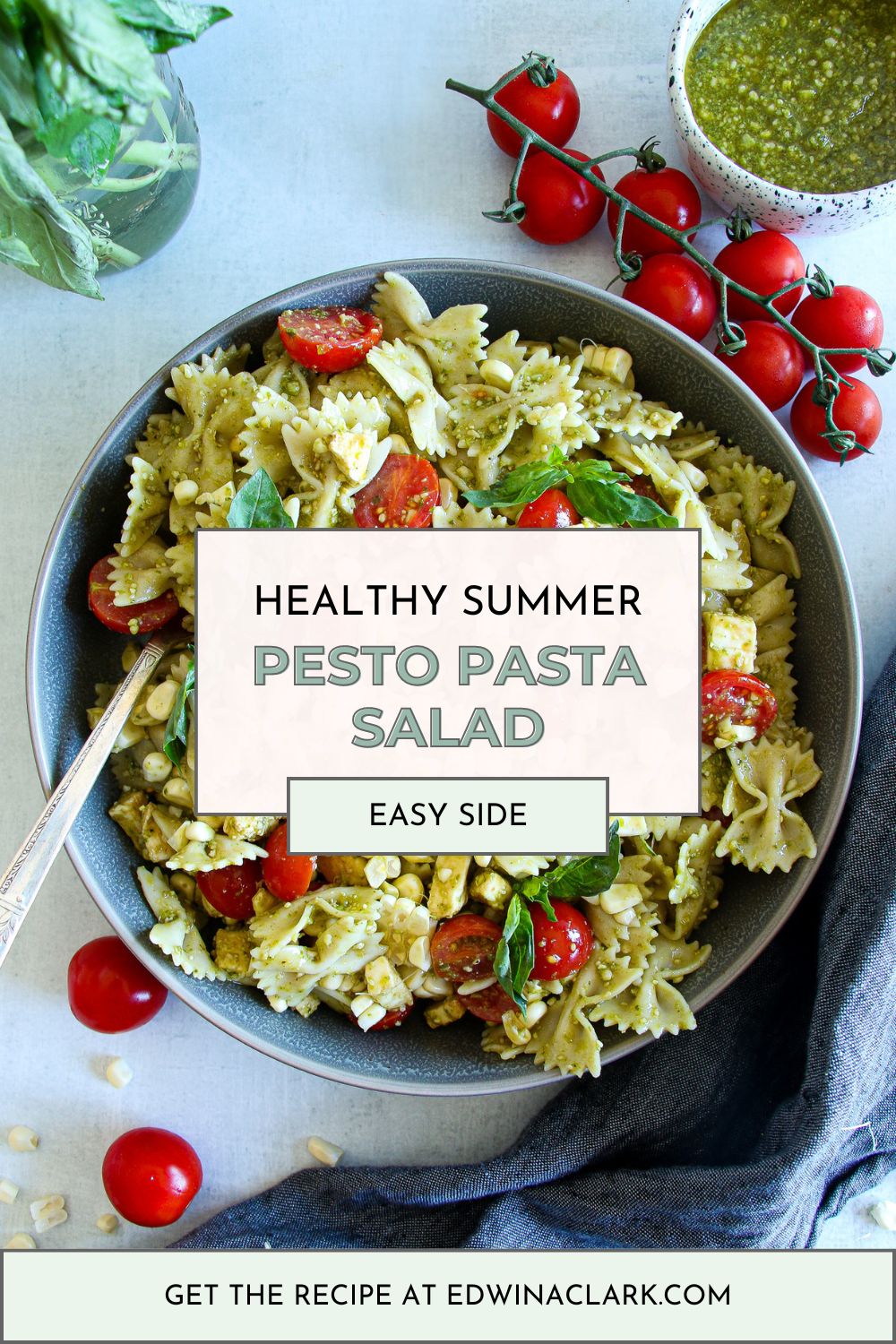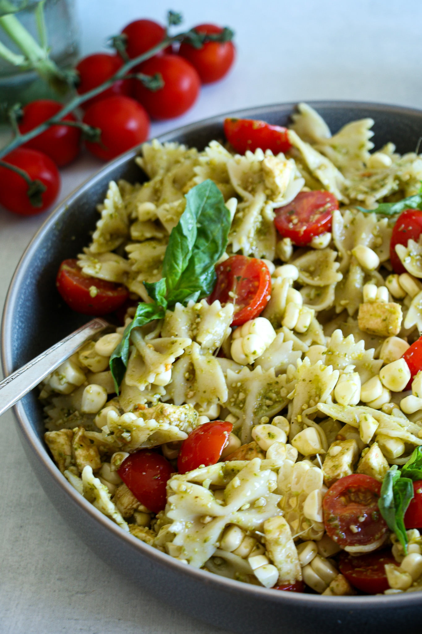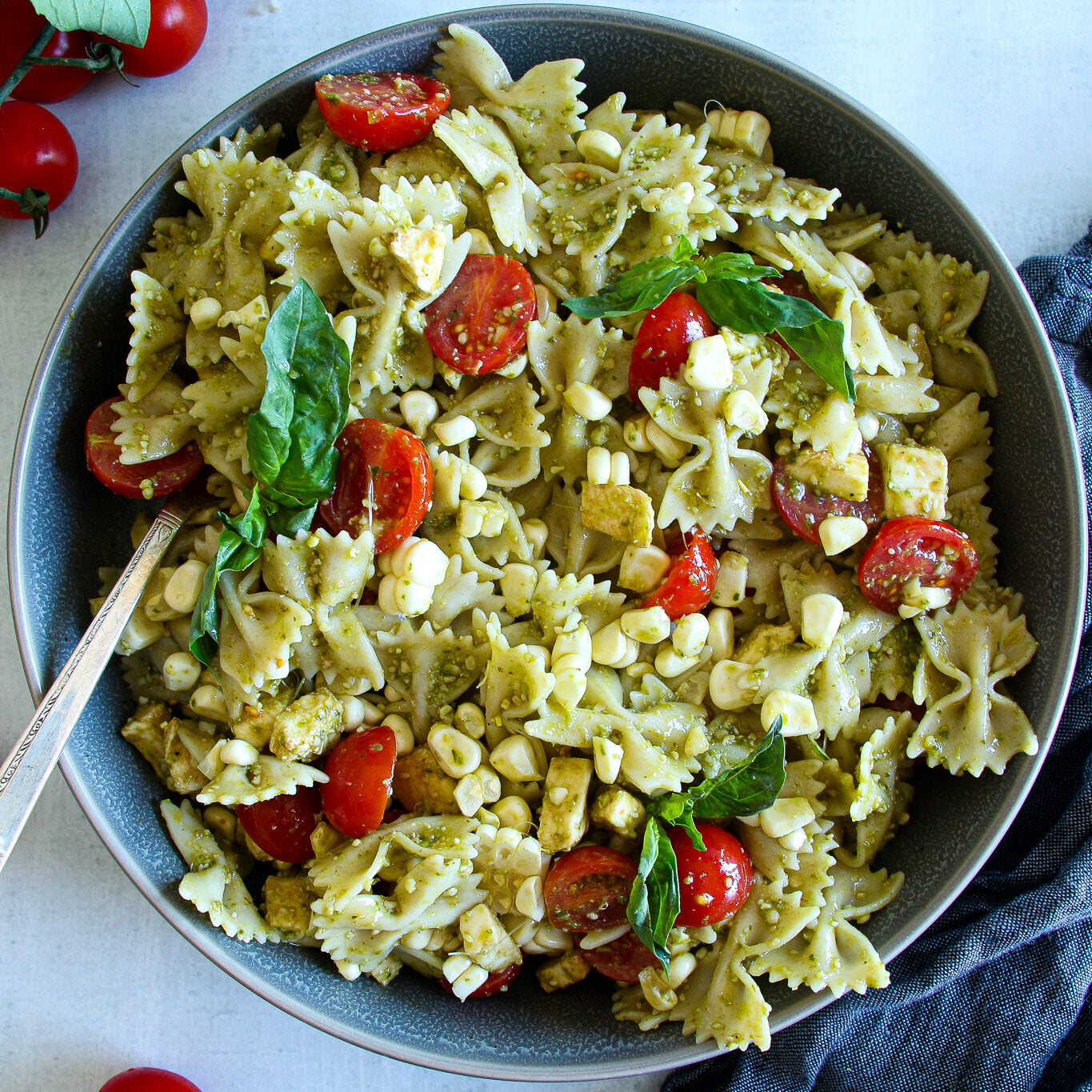 Laced with fresh corn, and sweet cherry tomatoes, this scrumptious pesto pasta salad comes together in minutes and celebrates some of the best and freshest flavors of summer.