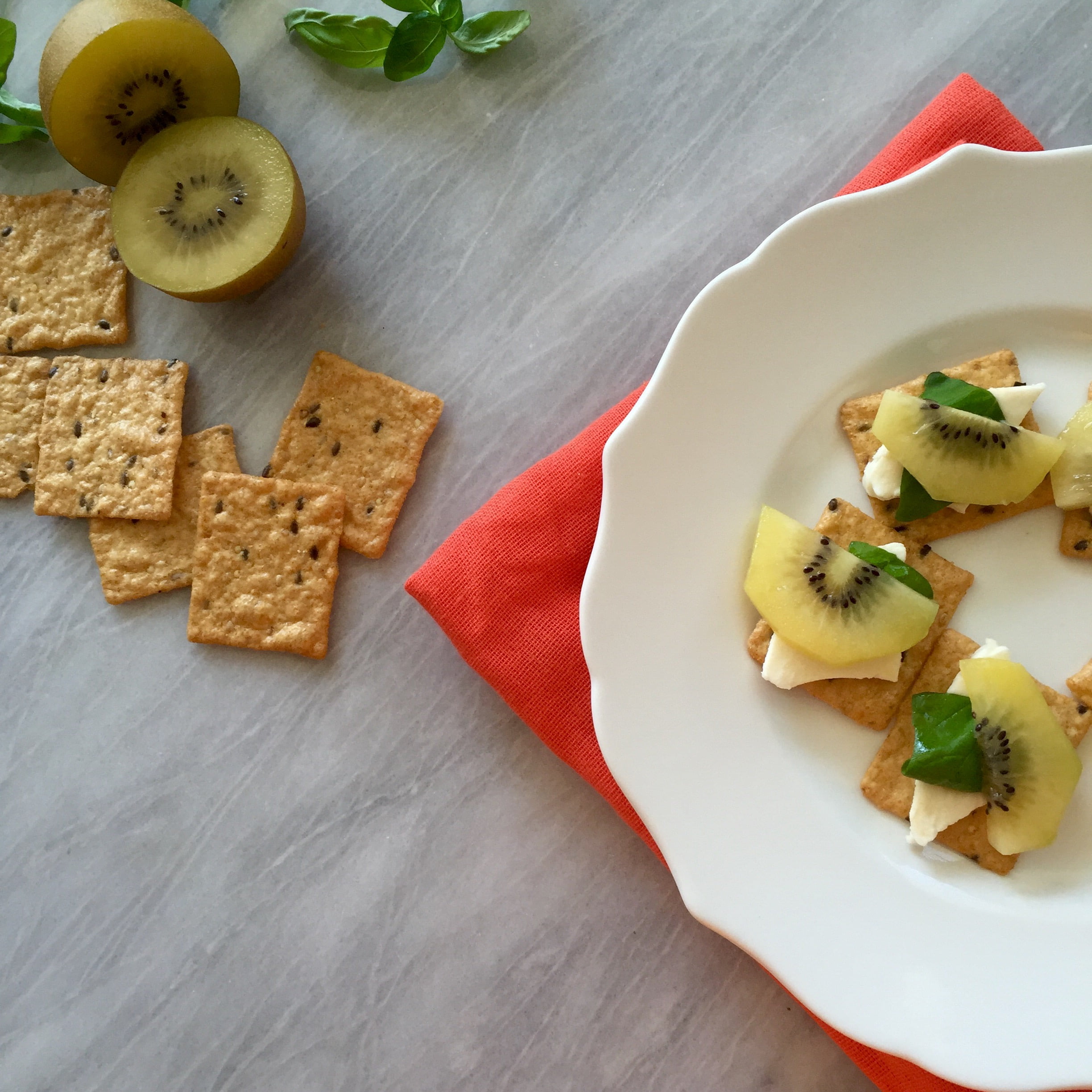 - Place the crackers on a serving platter. Top each cracker with mozzarella, half a basil leaf and half a slice of kiwi.