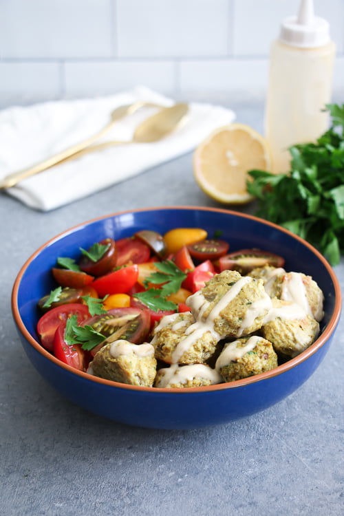 Made with lean ground chicken, turmeric, cumin, and parsley, these easy baked meatballs are packed with Middle Eastern flavors. Whip them up as a high protein snack or serve them over salad. There are so many things you can do with this gluten-free, dairy-free recipe!