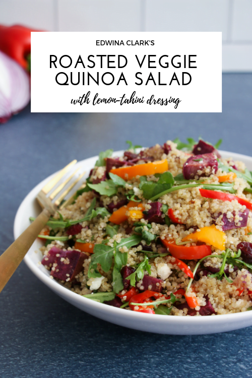 Roasted vegetable quinoa salad with creamy, lemon-tahini dressing. Vegetarian, GF. @edwinalclark.