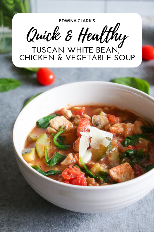 Quick and healthy Tuscan white bean, chicken and veggie soup. GF, DF, and delicious!
