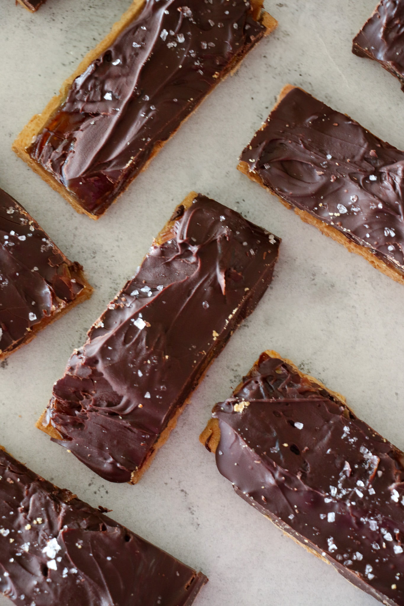 Armed with a plentiful supply of dates from Costco, I decided to try my hand at date bark and since then I’ve made several variations. This recipe is by far my favorite and won the approval of my husband and several dinner party guests. I substituted the peanut butter and peanuts for graham crackers and the result tastes like a Twix Bar without the drippy caramel. The best bit? My take on date bark only requires three ingredients.