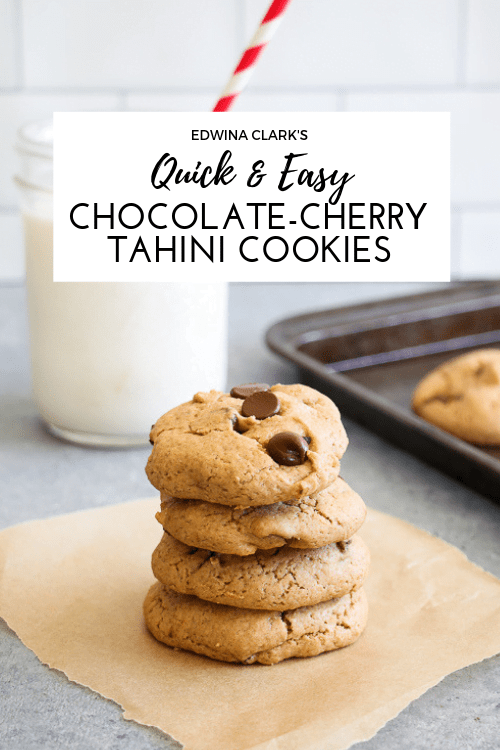 Chocolate-cherry tahini cookies made with tahini instead of butter. Gluten-free, dairy-free and ready in 15 minutes! @edwinalclark.