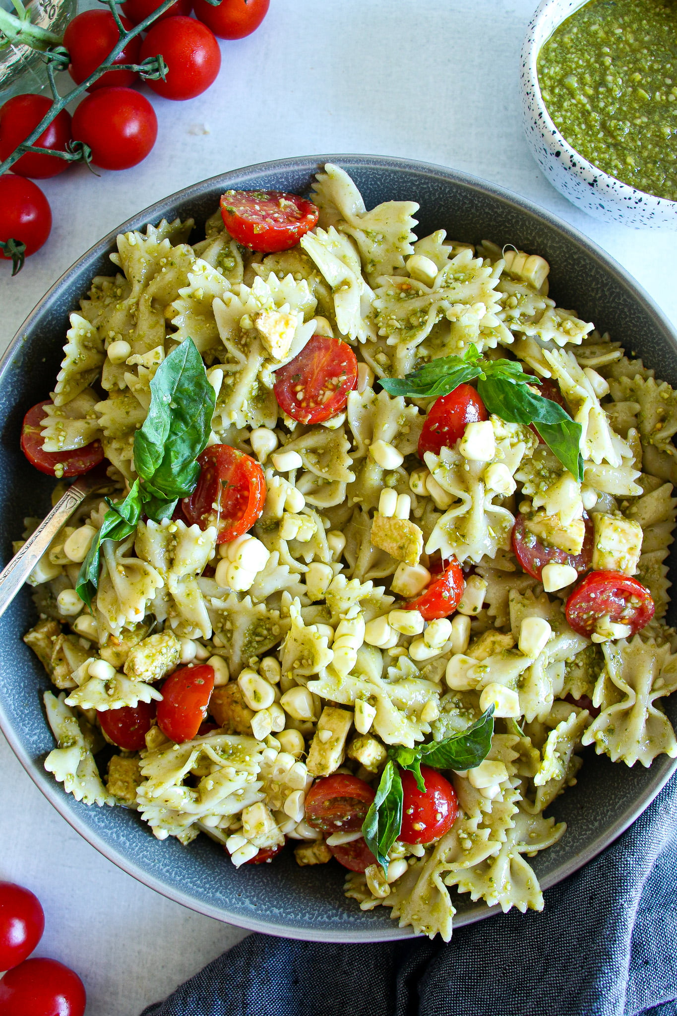 Laced with fresh corn, and sweet cherry tomatoes, this scrumptious pesto pasta salad comes together in minutes and celebrates some of the best and freshest flavors of summer.