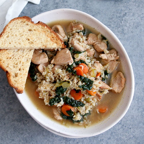 Warm-up on a cold day with this nourishing kale, chicken and rice soup. This one-pot dish is GF, DF and loaded with healthy ingredients.