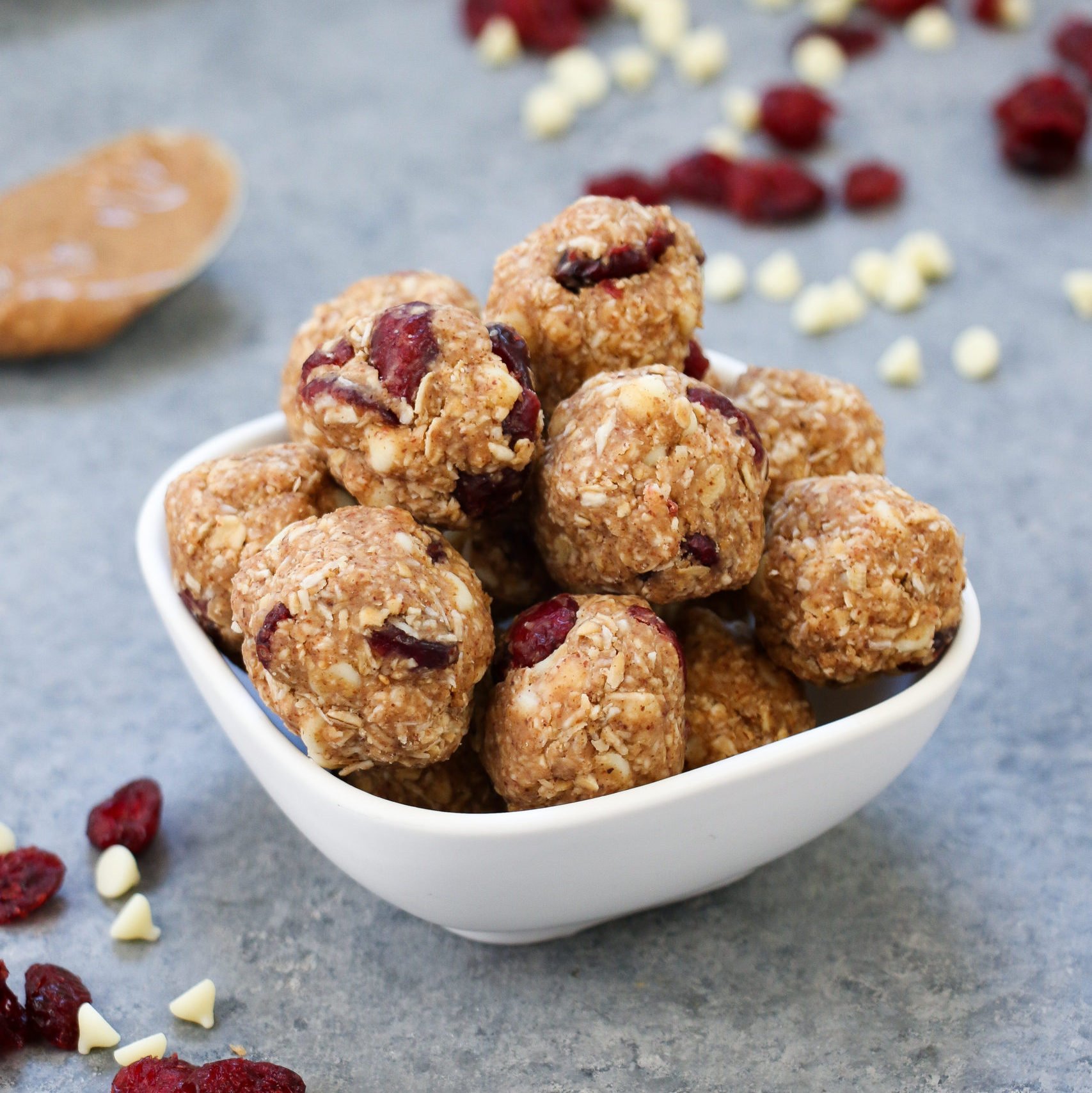 White Chocolate-Cranberry Energy Bites made with oats, almond butter, mini white chocolate chips, and dried cranberries.